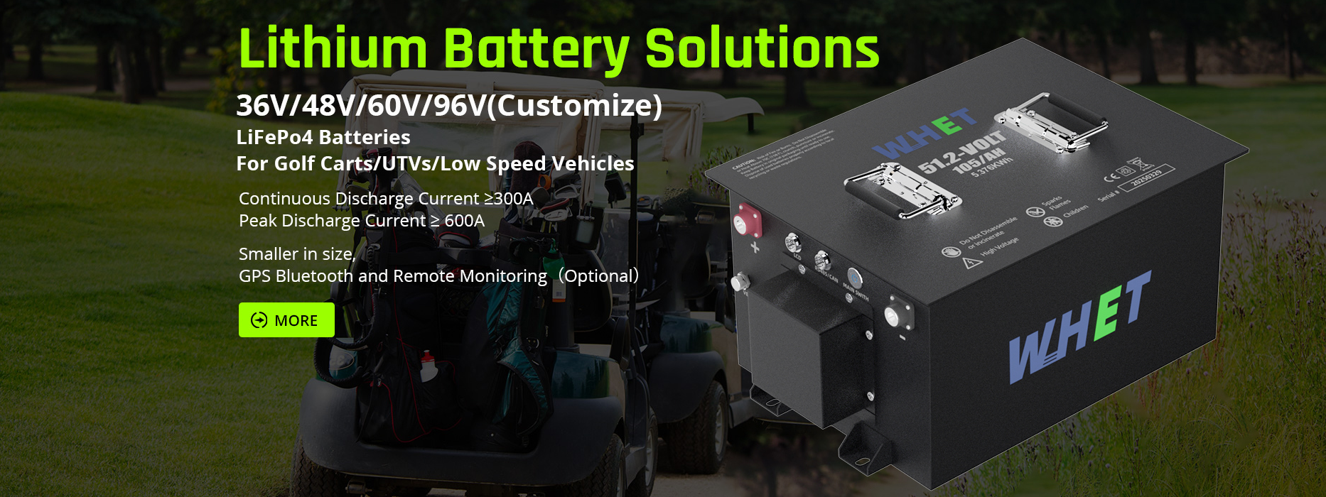 At WHET, we prioritize exceptional service and premium product quality for every customer. Our competitive prices empower clients to thrive in the market. With a focus on innovation, we offer residential solar energy storage and robust power batteries for diverse applications, including golf carts, marine vessels, and RVs. Our products hold international certifications, including IEC 62619, UL 1973, MSDS, UN38.3, CE, and RoHS.
